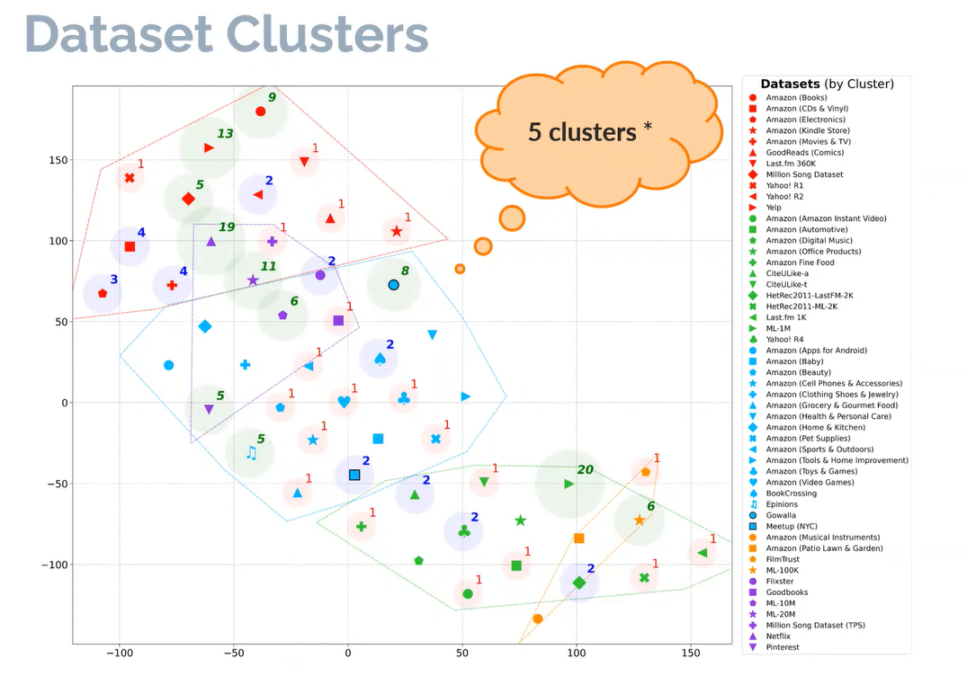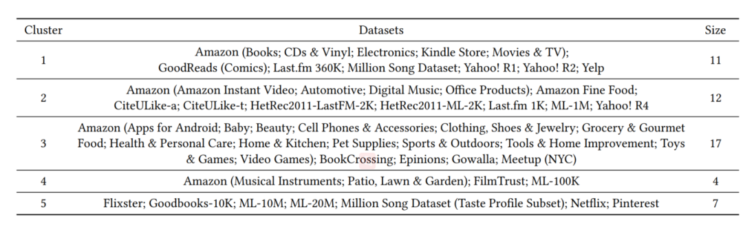 通过实验验证发现,对于不同相似性的数据集,算法的性能排名则不同,比如簇3中最好的算法RP3Beta在簇5中则最差。