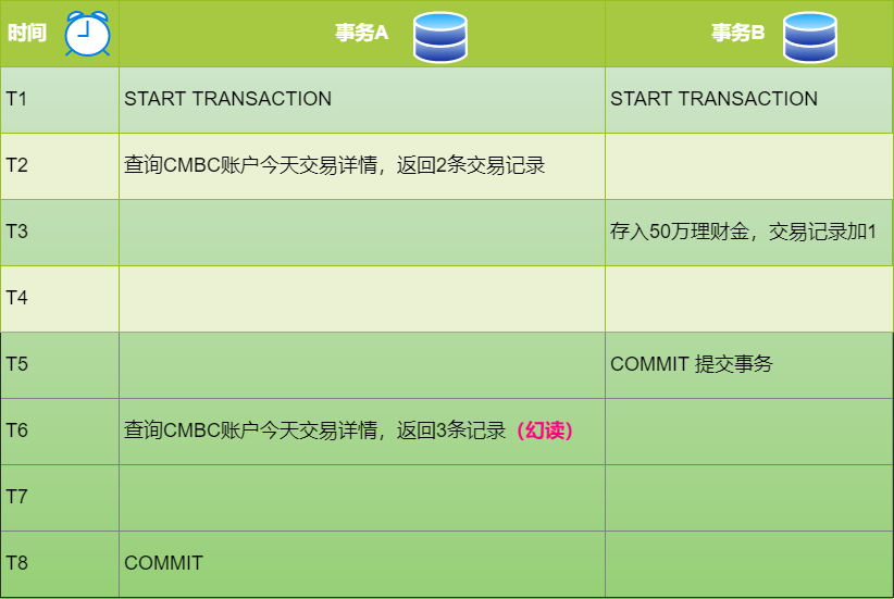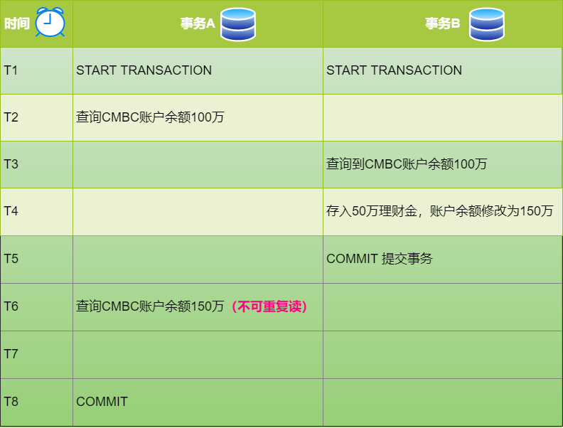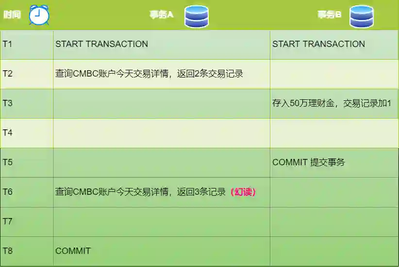 不可重复读的重点是修改:在同一事务中,同样的条件,第一次读的数据和第二次读的「数据不一样」。(因为中间有其他事务提交了修改)