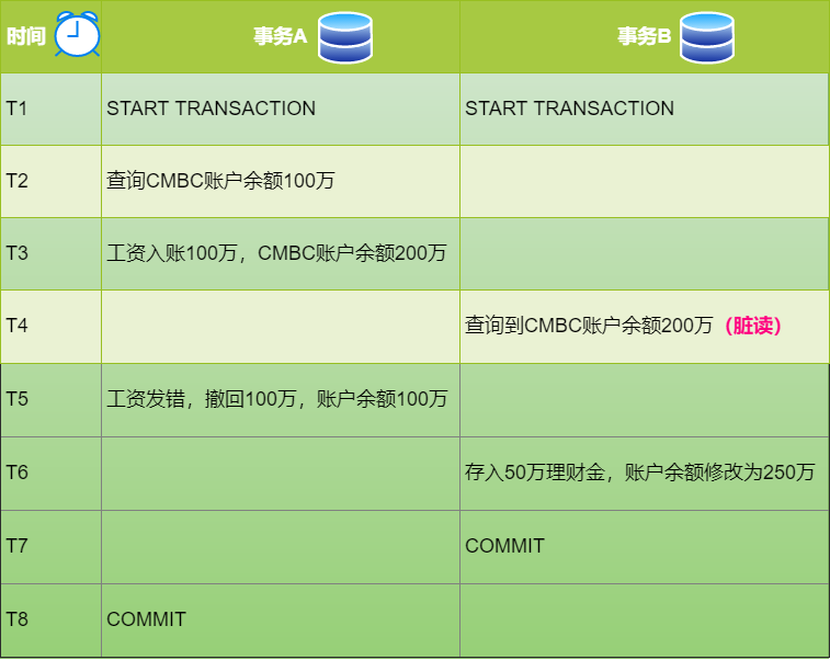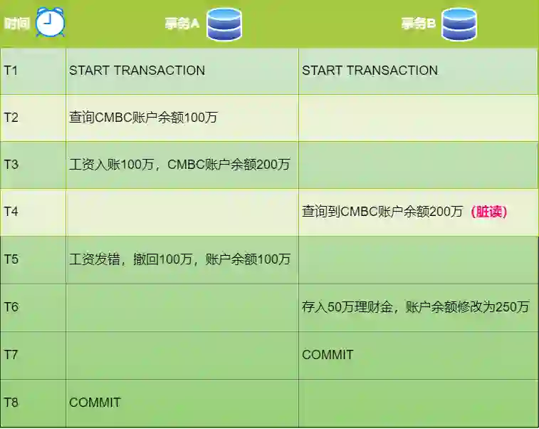 通常来说,一个事务所做的修改在最终提交以前,对其他事务是不可见的。在前面的例子中,当执行完第三条语句、第四条语句还未开始时,此时如果有其他人准备给lemon的CMBC账户存钱,那他看到的CMBC账户里还是有100万的。
