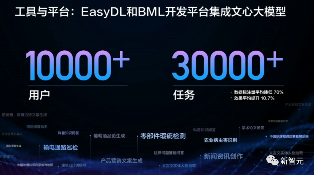 目前在EasyDL和BML平台上已有1万多用户用到了预训练大模型,创建了超过3万任务,通过大模型机制进行AI应用模型开发,数据标注量平均降低70%,效果平均提升10.7%。