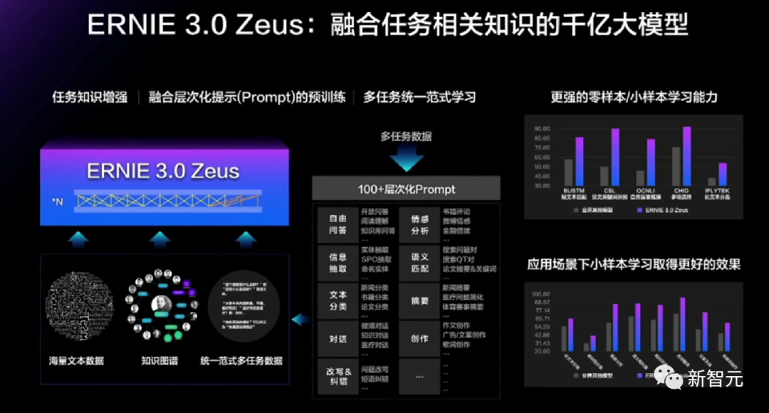 除了对无标注数据和知识图谱的学习之外,还通过持续学习对百余种不同形式的任务数据,实现了任务知识增强,显著提升了模型的零样本/小样本学习能力。