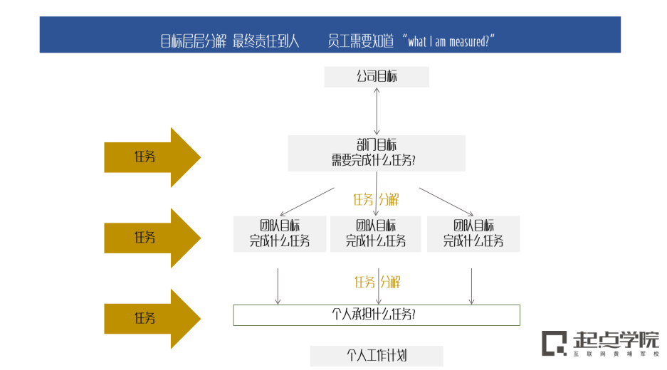 ◎ 对个人而言:当传达到个人时,每个人会根据产品规划的目标,围绕目标进行任务拆解,清晰的了解当前每项工作任务内容,并有效执行。