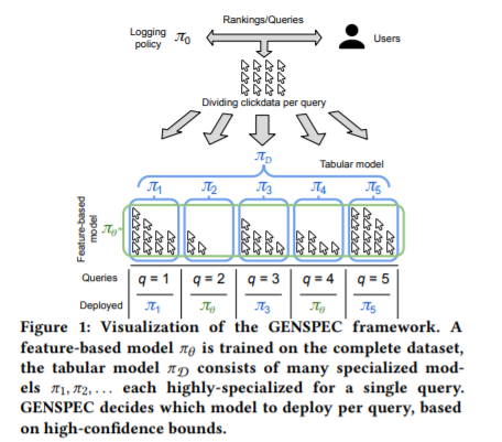 现有的反事实学习排名(LTR)工作集中于优化基于特征的模型,该模型基于文档特征预测最优排名。基于bandit算法的LTR方法通常优化表格模型,这些表格模型记住每个查询的最佳排名。这些类型的模型都有各自的优点和缺点。基于特征的模型在许多查询(包括那些以前未见过的查询)中提供了非常健壮的性能,但是,可用的特征往往限制了模型可以预测的排名。相反,表格模型通过记忆可以收敛于任何可能的排名。然而,记忆非常容易产生噪音,这使得表格模型只有在大量用户交互可用时才可靠。我们能否开发一种稳健的反事实LTR方法,在安全的情况下追求基于记忆的优化? 我们介绍了泛化和专门化(GENSPEC)算法,这是一种鲁棒的基于特征的反事实LTR方法,在安全的情况下,它会对每个查询进行记忆。GENSPEC优化了单个基于特性的模型以实现泛化:跨所有查询的健壮性能,以及用于专门化的许多表模型:每个表模型都针对单个查询优化了高性能。GENSPEC使用新颖的相对高可信度边界来选择每个查询部署哪个模型。通过这样做,GENSPEC成功地实现了专门化表格模型的高性能和基于特征的广义模型的鲁棒性。我们的结果表明,GENSPEC可以在具有足够点击数据的查询上获得最佳性能,而在数据很少或有噪声的查询上具有健壮的行为。