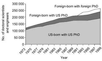 1973-1999年间,在美的科学类&工程类博士数量不断攀升,大概从1973年的10万上升到1999年的25万,其中,这一时期的国际博士数量,包括在国外获得博士学位和在美国获得博士学位的外国博士,从2万上升了10万左右。