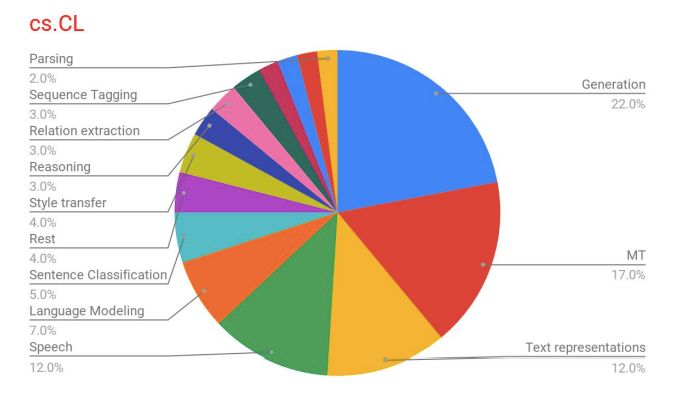图 1:cs.CL 领域 top-100 论文的任务分布情况。我们可以从中观察到自然语言生成任务是其中的主导任务。