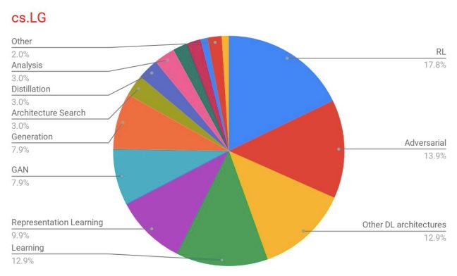 图 2:cs.LG 领域 top-100 论文的方法分布情况。我们可以从中看到强化学习和对抗学习是这些论文中使用最广泛的方法。