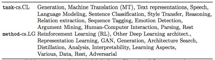 表 2:cs.CL 和 cs.LG 领域各自的任务和方法标签。