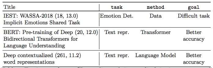 表 1:根据标准化后的引用量得到的 cs.CL 领域 Top-3 论文,及其任务、方法和目标。括号中的数字表示截至 2018 年 12 月时的引用量绝对值和标准化后的值。