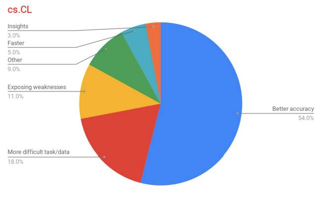 图 3:cs.CL 领域 top-100 论文的目标分布情况。我们可以从中看到超半数研究的目标是提高准确率。