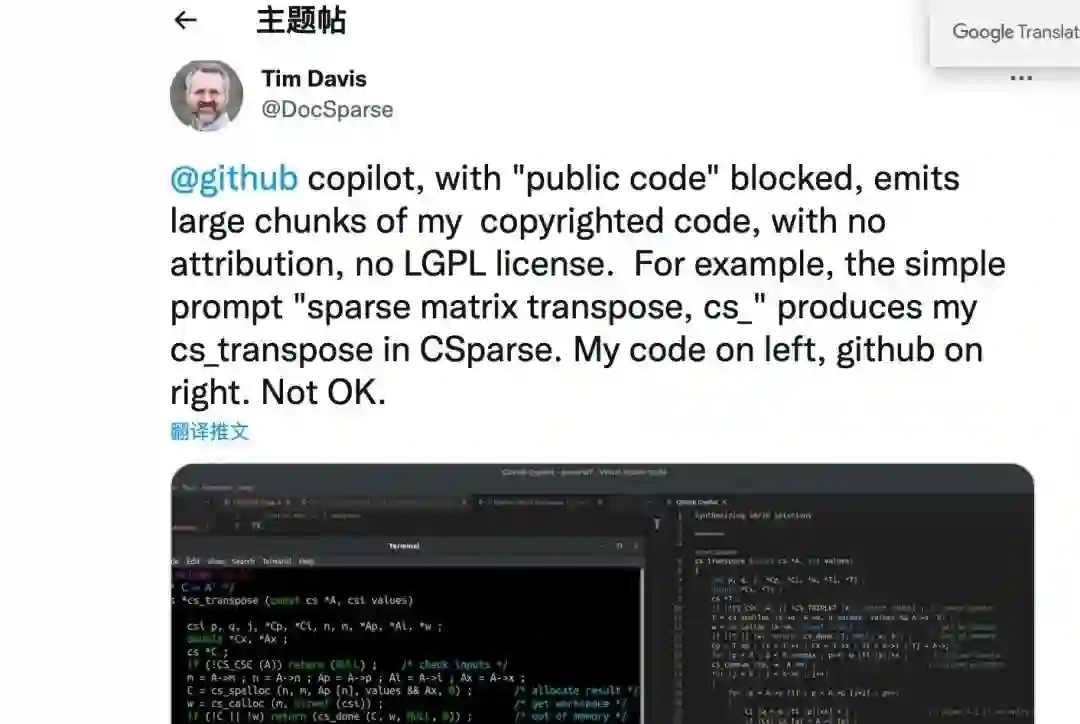 那这些建议真会惹出麻烦来吗?已经有 Copilot 用户控诉,Copilot 可能存在一种设计倾向,会从可识别的 repo 处一字不差地照搬代码。前段时间,得克萨斯农工大学教授 Tim Davis 也列举了不少证据,表明 Copilot 确实原样照抄了他的大段代码,特别是极具个人风格的 /Tim Davis 稀疏矩阵转置/。