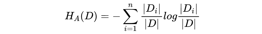 2)选择用样本的某一个特征 A 来划分样本集合 D 时,就可以得出特征 A 对样本 D 划分所带来的信息增益。特征 A 把 D 划分为 n 个子集,计算特征 A 对数据集 D 的条件熵 H(D|A):
