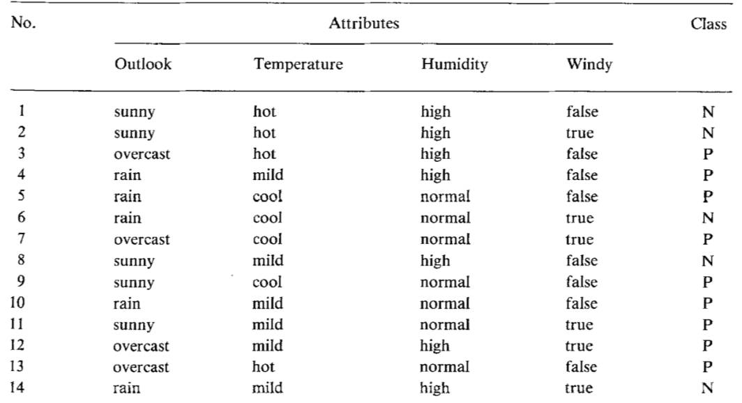 假设有两个分类,一个是 N,一个是 P,Outlook 表示天气情况,Temperature 表示气温情况,Humidity 表示湿度,Windy 表示有风,这四个作为特征,每个特征下面的离散值作为特征值。那么数据的熵