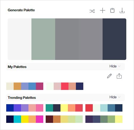 开启 Mosaic 后,你可以点击随机按钮获取新的配色盘,还可以下载 PNG 格式图片。如果你喜欢一整组色盘,可以将其加入收藏,或者锁定其中某一种颜色,Mosaic 会自己搭配其他互补色。另外,Mosaic 也会提供一些预设色盘供你选择,它们都是根据色彩流行趋势进行的搭配,日常使用完全足够。