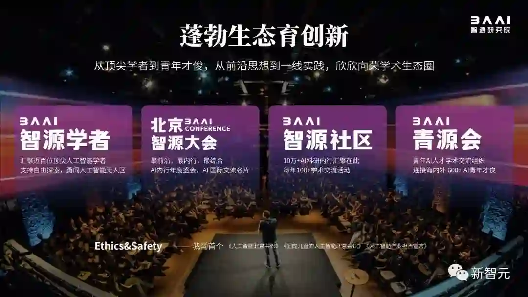 在生态创新方面,除了智源大会,还形成了智源学者、智源社区、青源会等层峦叠嶂、欣欣向荣的AI生态圈,从顶尖学者到青年才俊,从前沿思想到一线实践。