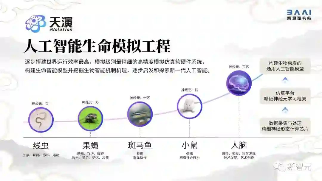 「天宝1.0」是天演人工智能生命模拟工程的第一步,未来,天演团队将持续实现模式动物和重要生物器官的精细模拟,构建生命智能模型并挖掘生物智能机制机理,启发和探索新一代人工智能,从果蝇、斑马鱼、小鼠直至最高智慧的人类大脑。