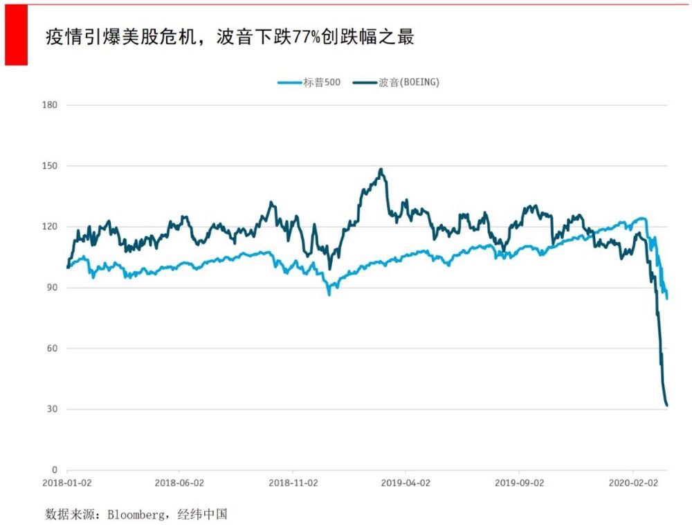 一些公司股票的跌幅超出想象。美股的核心资产之一波音,市值距高位已缩水77%,比美团低了接近100亿美元,而整个航空业都下跌了大半。随着国际旅行中断,一些资金链脆弱的航空公司已经快撑不住了。