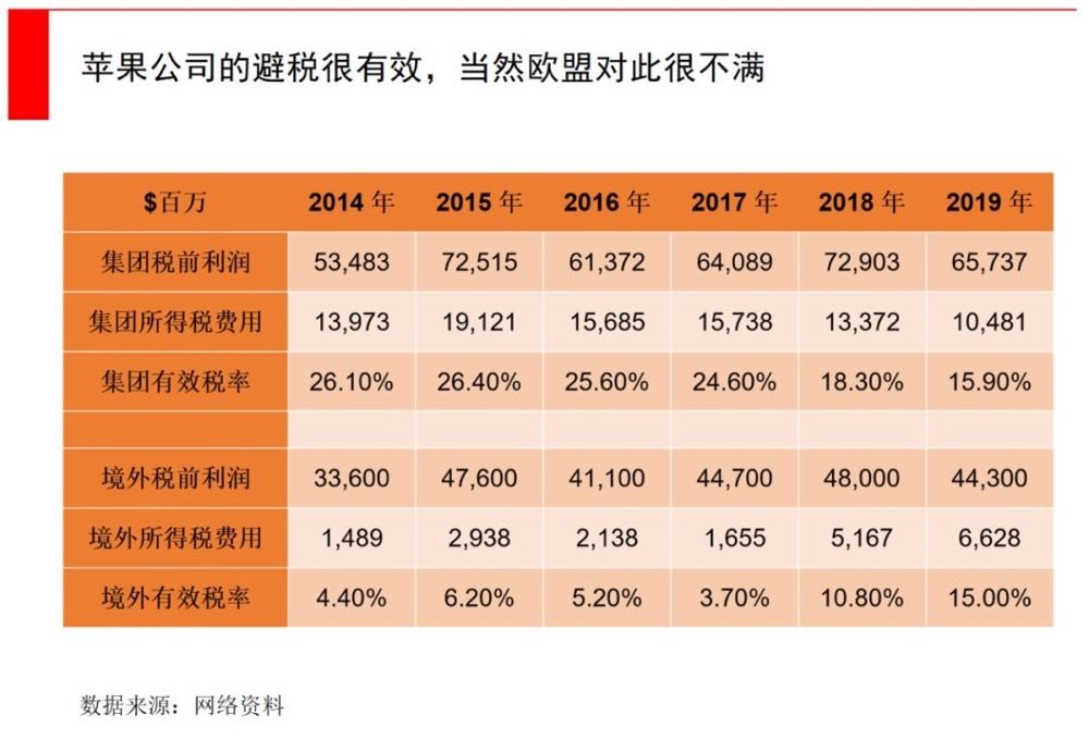1、苹果在爱尔兰设立苹果国际销售公司(Apple Sales International,“爱尔兰销售公司”),这家公司负责接收除了美国以外地区的所有销售收入,享受爱尔兰12.5%的低企业所得税税率;