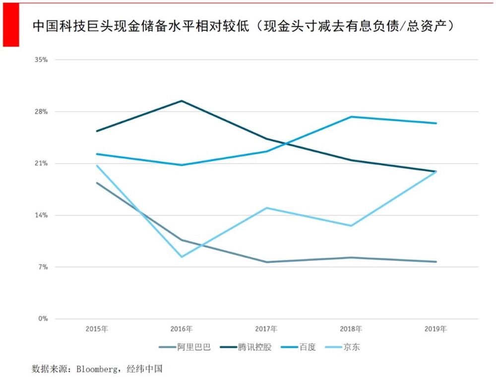 中国的科技巨头也大体符合这一趋势,只不过与FAAMG相比规模还比较小,腾讯、阿里、百度和京东在2019年总共囤积了6064亿人民币现金及等价物(866亿美元)。BATJ们正处于囤积现金的上升期,这些储备足以面对危机。