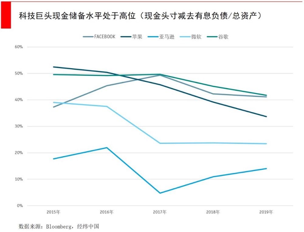 我们统计了市值前五大公司FAAMG(Facebook、苹果、亚马逊、微软和谷歌)的现金储备,发现这个数字高得惊人,2019年多达5700亿美元(cash, cash equivalents, and marketable securities,未减有息负债)。