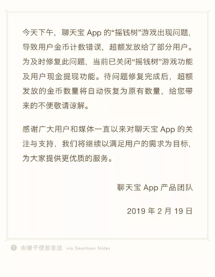 新榜讯 2月19日晚,聊天宝App针对“摇钱树”游戏出现问题,导致用户金币计数错误,超额发放给了部分用户作出回应:为及时修复此问题,当前已关闭“摇钱树”游戏功能及用户现金提现功能。待问题修复完成后,超额发放的金币数量将自动恢复为原有数量。