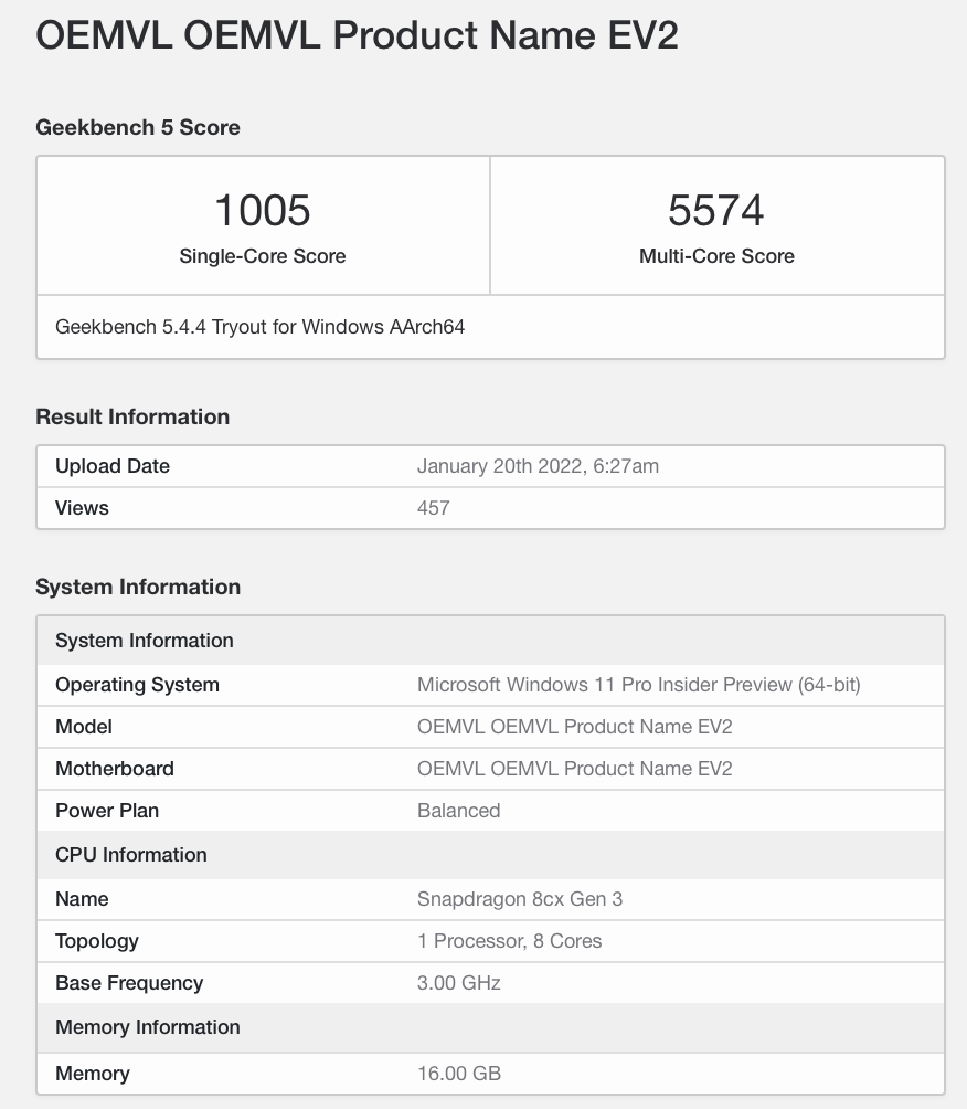 目前在跑分软件 GeekBench 上就出现了微软新一代 Surface Pro X 笔记本,搭载的便是骁龙 8cx Gen 3,型号名字为“OEMVL OEMVL”,具体的跑分为单核 1005 分,多核达到了 5574 分。而微软上一代的 Surface Pro X 搭载的是高通 SQ2 处理器,当时的单核分数为 800 分,多核分数则 3200 上下。也就是说单核分数提升了大约 12.5%,多核成绩提升幅度为 74%,多核成绩提升幅度还是相当明显的,应该是核心数更高了。虽然暂时没有 GPU 方面的得分,不过预计图形处理能力也有极大的提升。