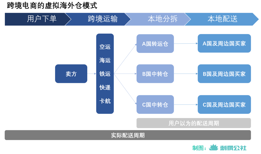 介于直发模式和海外仓模式中间,部分第三方物流企业发展出一种名为“虚拟海外仓”的模式,