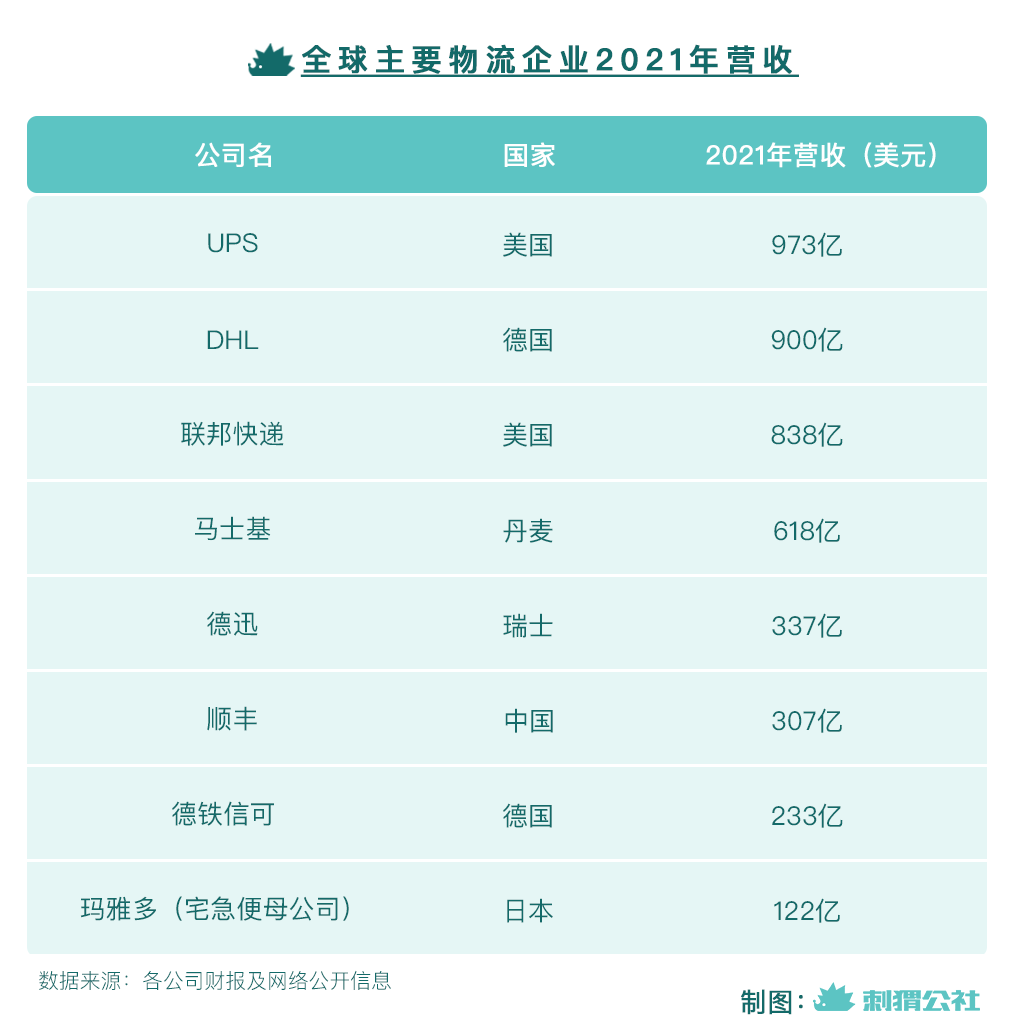 2021年,顺丰凭借307亿美元的总营收跻身全球物流公司营收前列。在它身前,UPS、DHL、联邦快递都是老牌快递巨头,在北美和欧洲市场有较强的统治力,马士基是全球最大的集装箱航运公司,德迅则是全球最大的海运代理公司。——在被疫情加速的线上消费浪潮下,这些物流公司各自取得高速业绩增长。而今年,顺丰有望凭借增速强劲的国际化业务冲击更靠前的位次。