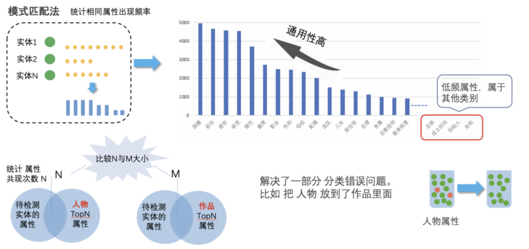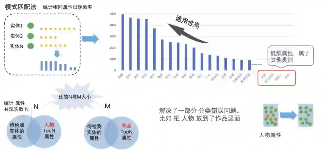 利用分值大于 6 的「必杀」特征,重新打标数据。除了「必杀」属性之外,阿里安全基于「模式匹配法」统计相同属性出现的频率。一方面,可以过滤掉低频属性,另一方面,基于假设:待验证实体的属性与 M 类属性共现的次数远远大于 N 类属性共现次数,可以判断该实体属于 M 类。用这种方法纠正了错误实体分类,如下图所示: