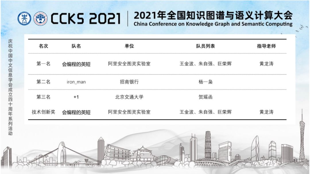 CCKS 2021 通用百科知识图谱实体类型推断竞赛获奖情况。