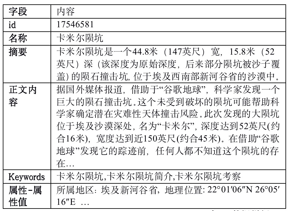 通用百科知识图谱实体类型推断任务围绕通用百科知识图谱构建中的实体类型推断展开,评测从实体百科页面出发,从给定的数据中推断相关实体的类型。数据示例如下: