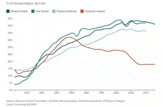 然而,在 1984 年左右,情况发生了重大的转折。学习计算机的女性比例急剧下降,随着医学、法律和其它学科的女性学生逐渐逼近 50%,计算机领域的学生却一再下降到 20% 以下。