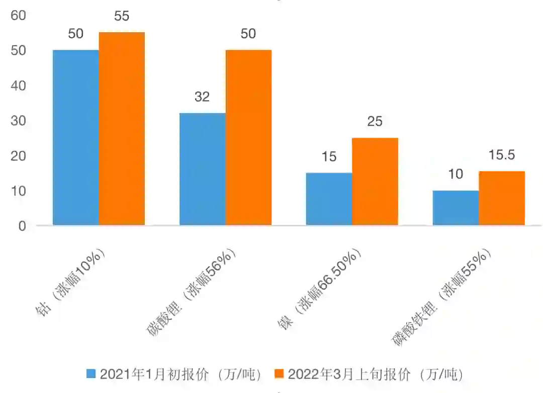 从2020年1月初到2022年1月中旬,电池级钴涨幅达到119%。碳酸锂更为疯狂,鑫椤锂电数据显示,3月2日电池级碳酸锂价格突破50万元/吨,相比年初上涨约67%。而在2021年初,碳酸锂价格仅为5万元/吨。