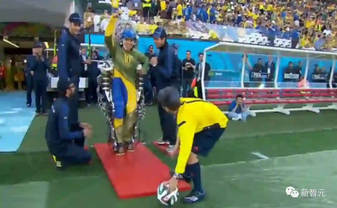 2014年巴西世界杯上,28岁的截瘫青年朱利亚诺·平托身穿基于脑机接口的「机械战甲」为比赛开球。