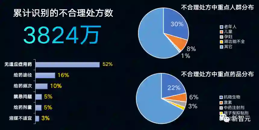 对于基层开出来的不合理用药处方,智医助理提示了3800万人次,而这其中有52%是无适应症用药,也就是「头疼」却开了「医脚」的药。