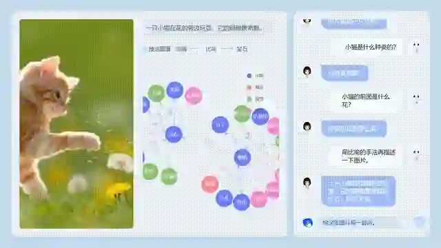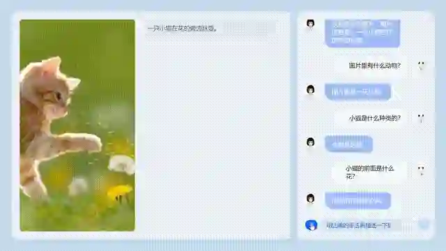 比如,在AI收到这张图片后,就会自动回答:图片内容是一只小猫在花的旁边玩耍。然后还能答出小猫的种类、小猫旁边是什么花。