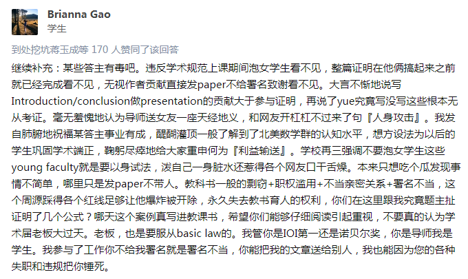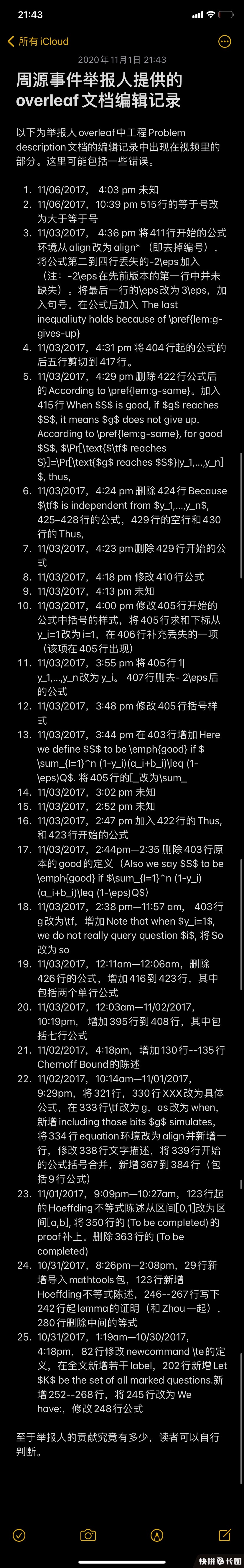 题主在帖子中曾提到,Ta希望:1、Yuan Zhou向其道歉,因为他不尊重Ta的工作(无论工作是大是小);2、Yuan Zhou肯定Ta的工作,将Ta的名字加入论文作者名单或在致谢部分肯定Ta的贡献,由专家裁定;3、如果没有清晰的证据证明Yue对论文的贡献,应将Yue从论文作者名单中除名;如果Yue被列为该论文的一作,她应说明自己对论文的贡献大于题主;4、如果第2点与第3点要求无法满足,则应撤回该论文。尽管质疑声四起,但支持题主维权的声音也蜂拥而至。网友@Briana Gao抨击了Yifan等人的言论。在他看来,周源及其女友踩了多条红线:剽窃、职权滥用、不当亲密关系、署名不当:此外,将论文送给没有参与研究的女友,无疑会让人觉得女性科研者可以凭借两性关系、而非自己的科研实力获得学术成就,对全体女性科研者的声誉产生了破坏。至于题主对论文的贡献,网友@真实和永恒等人提到:1)无论题主的编辑记录是否trivial,只要有权利在Overleaf里写东西,都可以作为co-author;2)曾一起讨论、做题,并取得了明确的结果,便默认是合作者;3)借助了Prof Jeff Erickson的话:Ideas are cheap, what matters is who did the actual work. (点子不重要,重要的是谁做了实际的工作。)尽管知乎与Reddit上热议不断,但相关部门仍未给出回应,周源及其女友也没有作出任何回应。换言之,事实的真相仍不可得知。大家怎么看?