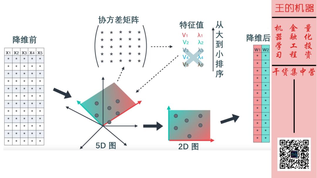 求出特征向量和特征值,将特征值从大到小排序,去除明显比较小 (这个需要点主观判断) 的,假设去除了后三个,保留了前两个。
