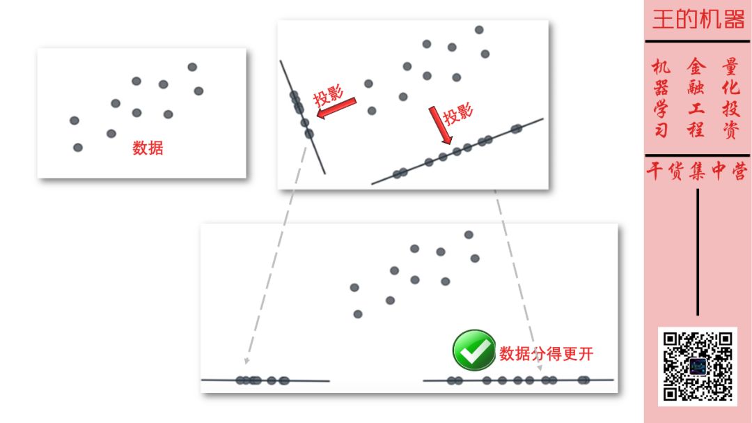 给定 2 维数据,如果向两条线上做投影,应该选择投影后数据分得更开的那条线。试想假如接下来做分类是不是更容易些?