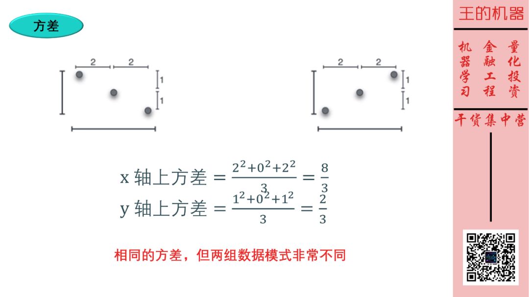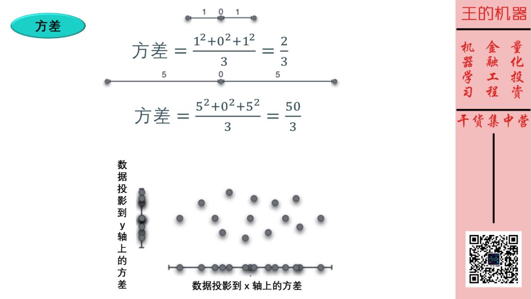 方差的概念稍微难些。方差是衡量数据和其均值的偏离程度。如上图上半部分,两组数据的均值都为 0 ,而第二组数据的方差 (50/3) 大于第一组数据的方差 (2/3),因此第二组数据更加分散些。