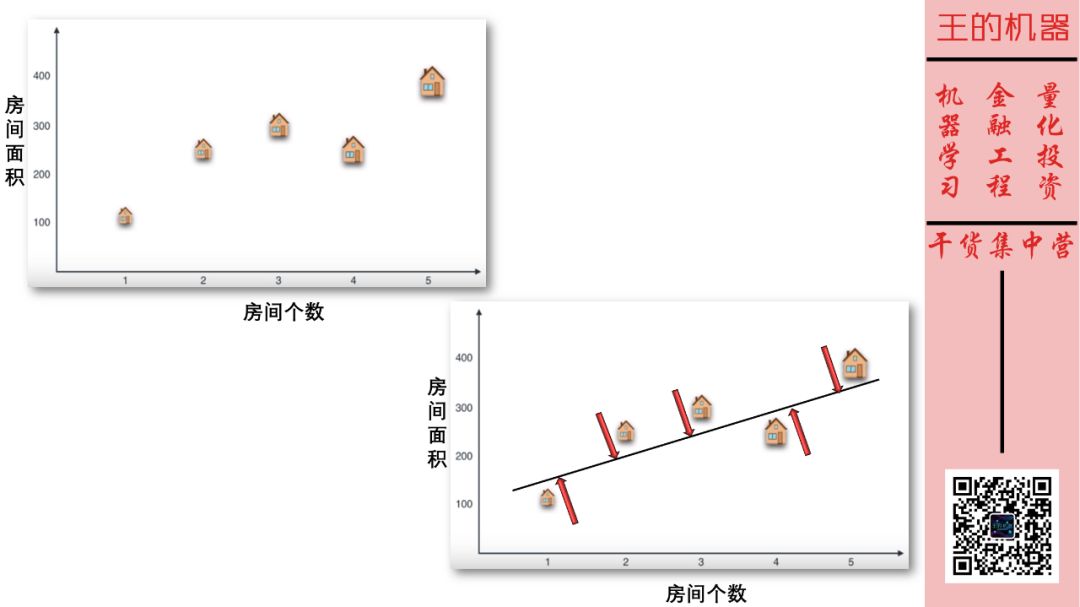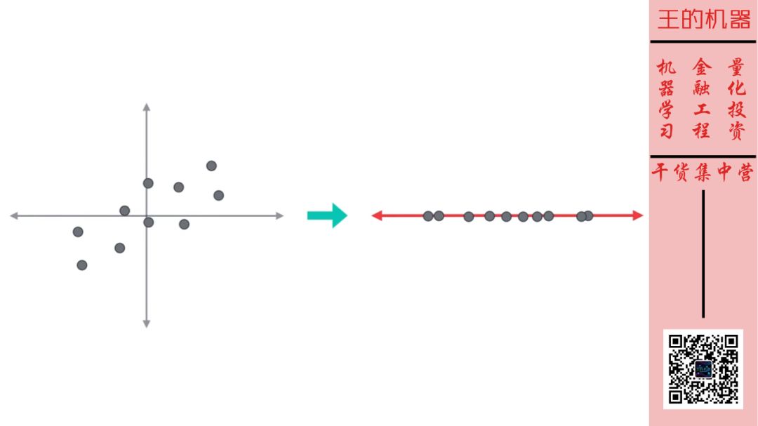 将这 2 维特征实例化为房间面积和房间个数,它们通常成正比关系。假设我们找到一条向上的直线,将这 2 维特征投影到该直线上,如下图。