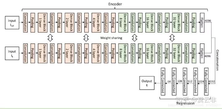 它的网络分为编码网络和回归网络两部分。编码网络采用了DenseNet的模块来搭建,并采用了权值共享的方法来获得参考图像与浮动图像匹配的特征,同时减少参数数量。我们可以看到它的编码网络网络深度还挺深的,有70层(输入图像30*320*320),作者并没有提到如何选择网络的深度,但我个人认为可能是较浅的网络无法提取出复杂的特征用于回归。另外,这个回归网络层数也较深,一层一层神经元数量逐步减少,最终回归出12个参数,而不是从8192个神经元直接回归出12个。