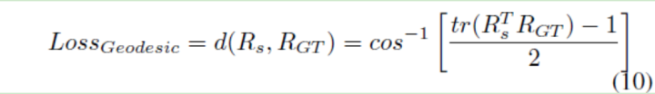 论文的核心创新点就在于geodesic loss的应用。作者说MSE是一个凸函数,能很好地收缩学习过程中的搜索空间,解决常见的陷入局部最优问题。但是MSE并不能准确地表示两个旋转矢量之间的距离,所以为了提高准确度,作者采用了测地距离,也就是单位球面上两个点之间的最短距离。