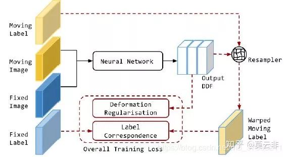 这种方法是先事先分割出关键部位,如脏器部分,血管,关键点,导管等作为标签,训练时计算扭曲后的标签与固定图像上的标签的相似性测度(一般是Dice)作为目标函数的一部分。顺带一提,对于弹性配准,目标函数还要包含形变场的正则项。