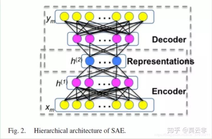 上图是SAE网络,蓝色的部分就是我们想要的特征向量。我们训练该网络希望该网络的输出ym与网络输入xm尽量相似。