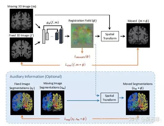 惯常的做法是通过FCN全卷积网络生成形变场,再通过STN(Spatial transformer networks)得到扭曲后的图像,目标函数为扭曲后图像与固定图像的灰度相似性测度和形变场的正则项。