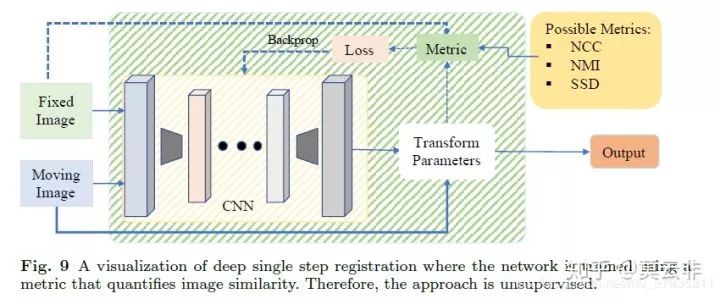 这是最早的将深度学习应用于医学图像配准的研究。基本的配准思想还是传统的那些,只是在传统方法中嵌入了神经网络用来提取特征,或者学习相似性测度等。与其他两种方法的最直观的区别在于这种方法每配准一对图像都要迭代优化去寻找最优解。
