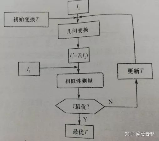 I1,I2是待配准两副图像提取特征后得到的特征空间,也可以将原图所有像素作为特征空间,此时的I1,I2就是待配准的两张图像;我们选择一个合适的变换模型(比如仿射变换),将I2变换后得到I2*,选择合适的相似性测度计算I2*和I1的相似度,我们希望这个相似度越小越好,因此需要采用一种优化策略(或者说优化算法)来迭代优化目标函数相似度,找到合适的几何变换参数使得相似度最小。一些人工设计的相似性测度经常被使用,比如平方和误差(SSD),互相关函数(CC),互信息(MI),标准互相关函数(NCC),标准互信息(NMI)。
