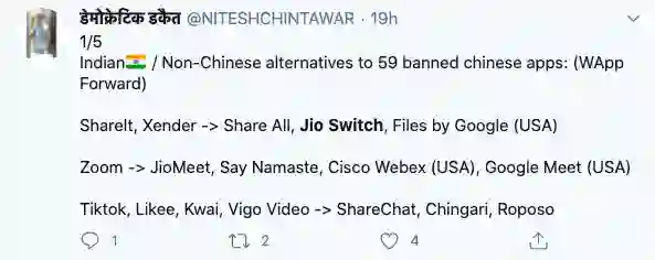 印度网友推荐可以用本土开发的Jio Switch和Share ALL,代替茄子快传和闪传。