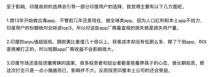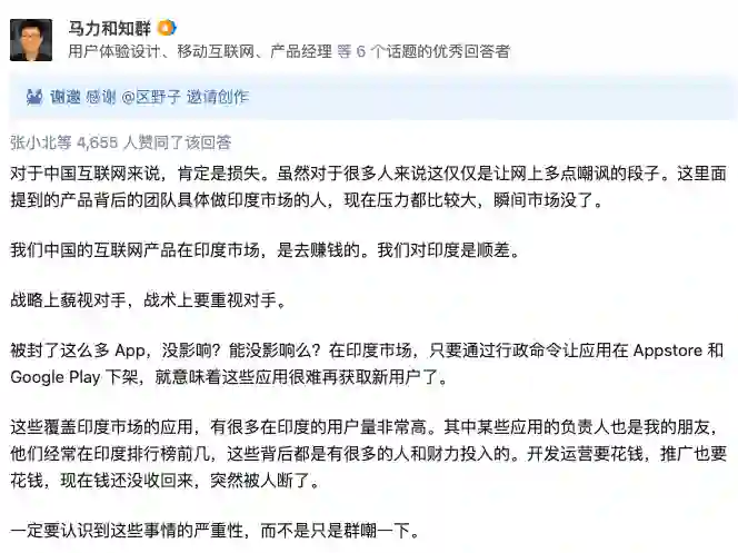 知乎网友@马力和知群认为,印度市场用户量很高,下架应用将无法获取新用户,这个损失还是很严重的。