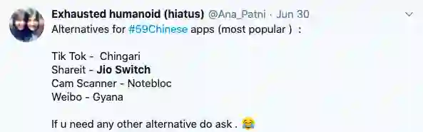 印度网友给出了各种各样的替代版本,有的是印度开发,也有美国开发,总之就是要把所有的中国App替换掉。